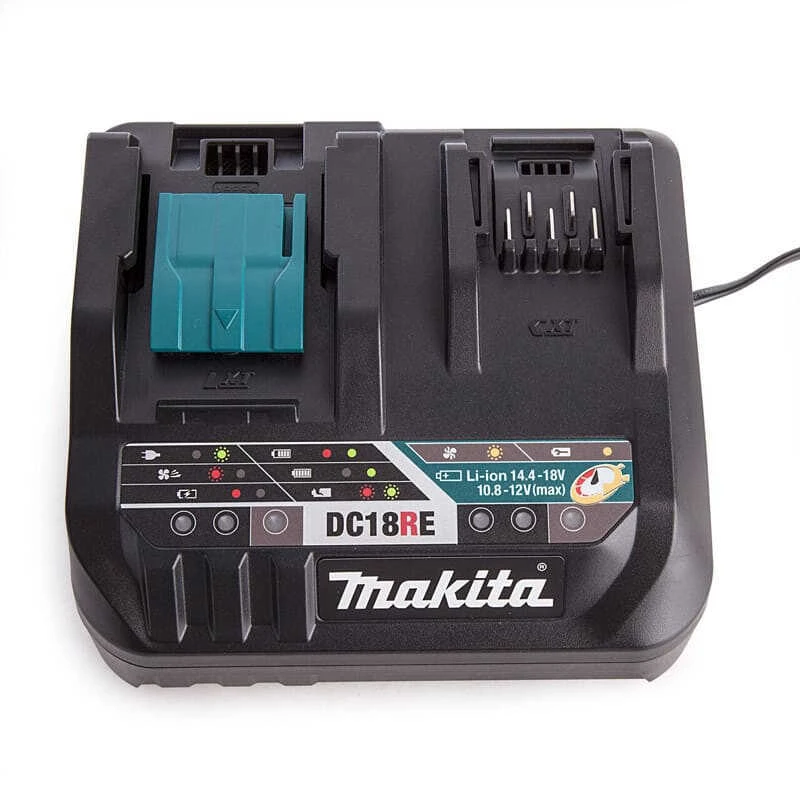 Le chargeur rapide Makita DC18RE possède un ventilateur à air forcé afin de refroidir la batterie pour minimiser le temps de charge. L’affichage d’alimentation numérique identifie l’état de la batterie et la condition de charge. Les informations de la puce mémoire de la batterie sont lues pour déterminer la méthode de charge optimale. Son design compact a été conçu autour du chargeur à port unique, un port de charge supplémentaire a été ajouté avec une longueur totale de seulement 12 mm de plus.