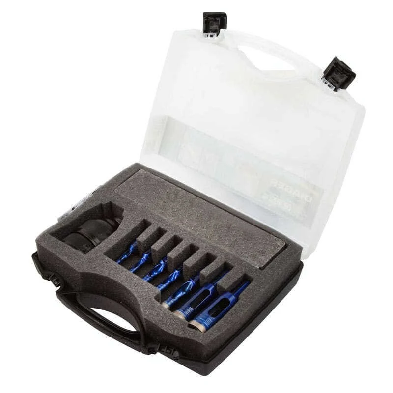 Pour des perçages propres et sans éclats dans le carrelage, marbre, grès émaillé et céram, ou encore la terre cuite, optez pour les forets diamant Blue Céram. Les 7 forets diamant contenu dans la mallette sont conçu de façon à évacuer la matière de manière efficace pendant le perçage, ce grâce à leurs gorges d’extractions. Peut être utiliser de façon simple et rapide sur une perceuse sans mode de percussion, cependant, le kit comprend un mandrin d’attachement pour une utilisation tout aussi efficace sur meuleuse.