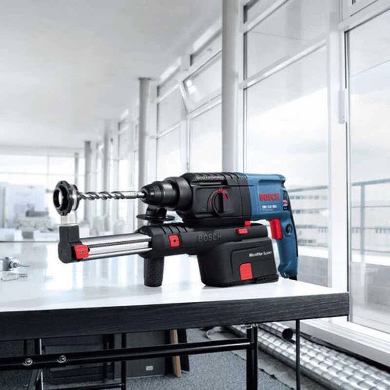 Le perforateur Bosch GBH2-23REA représente une solution compacte pour vos travaux de perçage ou de vissage sans poussière grâce à son dispositif d’aspiration intégré amovible. Etant très compacte, le travail en hauteur reste confortable avec cette machine. La perceuse est fournie avec un jeu d’adaptateurs permettant d’aspirer la poussière lors de travaux avec des couronne-trépans mais est aussi utilisable avec un aspirateur externe.